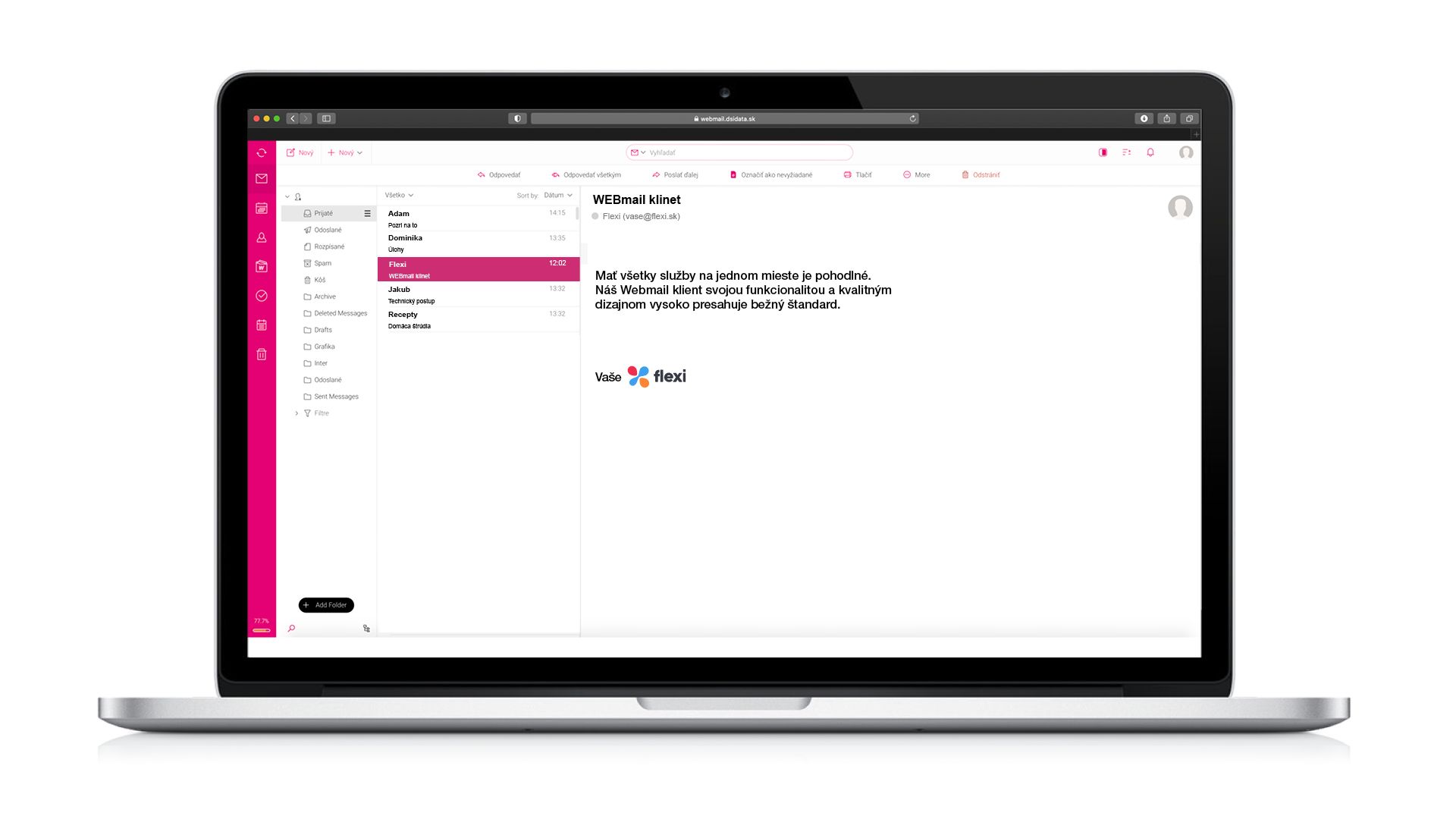 - K dispozícii je zároveň možnosť pohodlne pracovať s emailami cez webový prehliadač prostredníctvom webmailu. Takto môžete svoje emaily vybavovať kdekoľvek sa nachádzate, stačí mať prístup k počítaču s internetom a nemusíte nikde nič zdĺhavo nastavovať.